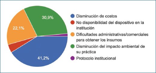 Al indagar por los motivos del reúso (Fig. 1), menos del 30% de los encuestados reconocen el impacto ambiental como la principal razón para reutilizar dispositivos médicos; en la mayoría de las ocasiones, la disminución de costos (41,2%) y la dificultad para obtener los insumos constituyen las motivaciones principales para el reúso (22,1%). En este contexto se estableció que más de la mitad de los participantes no cuentan o no conocen la existencia de protocolos o lineamientos institucionales para el reúso o reprocesamiento de dispositivos médicos (Tabla 2), mientras que el 33% de quienes acuden al reúso no disponen de marcos institucionales ni herramientas estratégicas para el reprocesamiento.