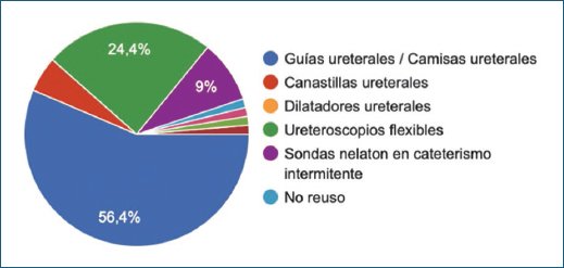 Los dispositivos que con mayor frecuencia se reúsan corresponden al ámbito de la endourología y son las guías y las camisas de acceso ureteral (56,6%), seguidas por los ureteroscopios flexibles descartables (24,4%) (Fig. 2). Con respecto a las preocupaciones sobre los riesgos de estas prácticas, el 48,7% de los participantes consideran que el reúso no aumenta el riesgo de eventos adversos, pero se reconocieron como principales preocupaciones asociadas al reúso la posibilidad de fallo del dispositivo (57,1%) y la aparición de infección en el paciente (36,7%).